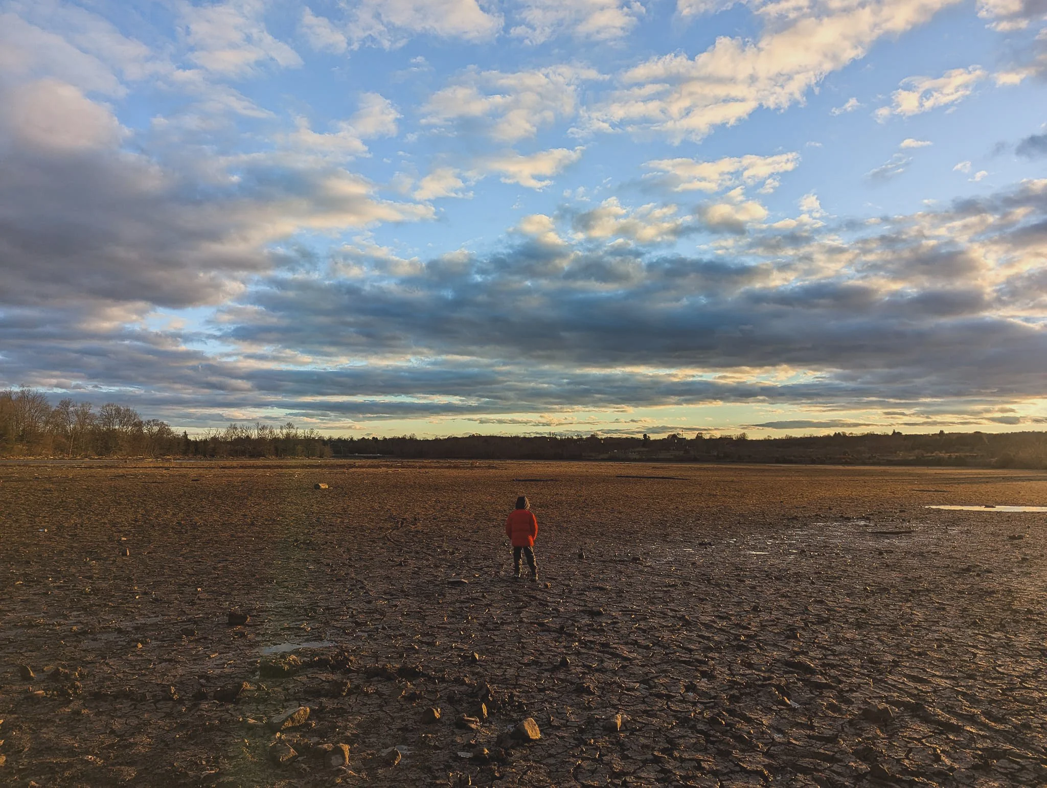 We’re in desperate need of rain. It’s been since late Spring and whatever precipitation we have got has not amounted to anything. The cracked soil swallows up everything quicker than it can fall from the sky. I’ve never walked across a lake before, but today marks a first for me and my son.