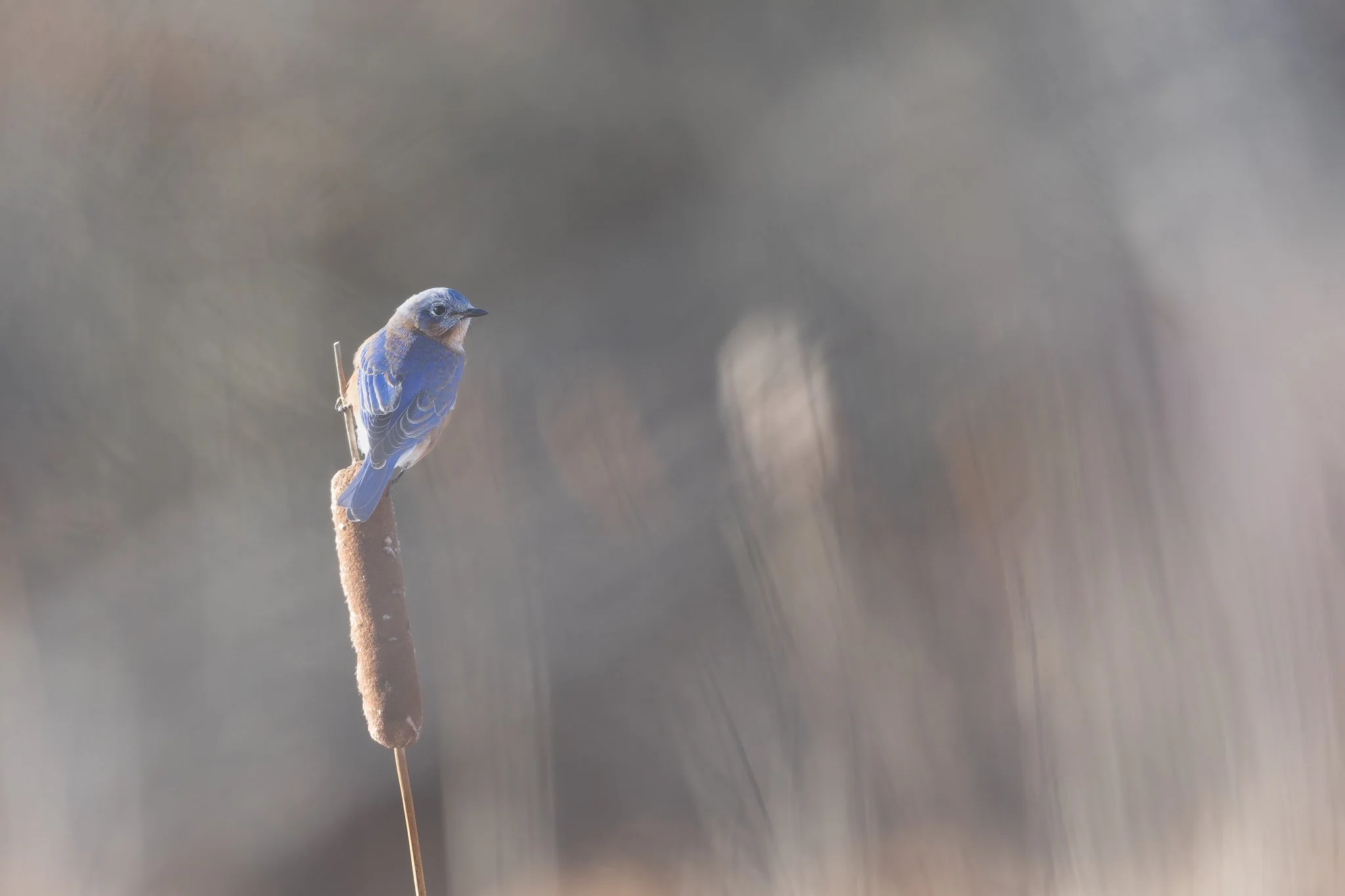 The trail opened up to a frozen marsh. Winds gusts blew the cattails back and forth. A flock of blue birds hung around the trees on the edge. Personally, I love cattails. Obviously, I love birds. Put the two together, and I get all sorts of excited. 'Come on. Give me a bird on a cattail,' my inner thoughts were loud. 'That would be perfect.'